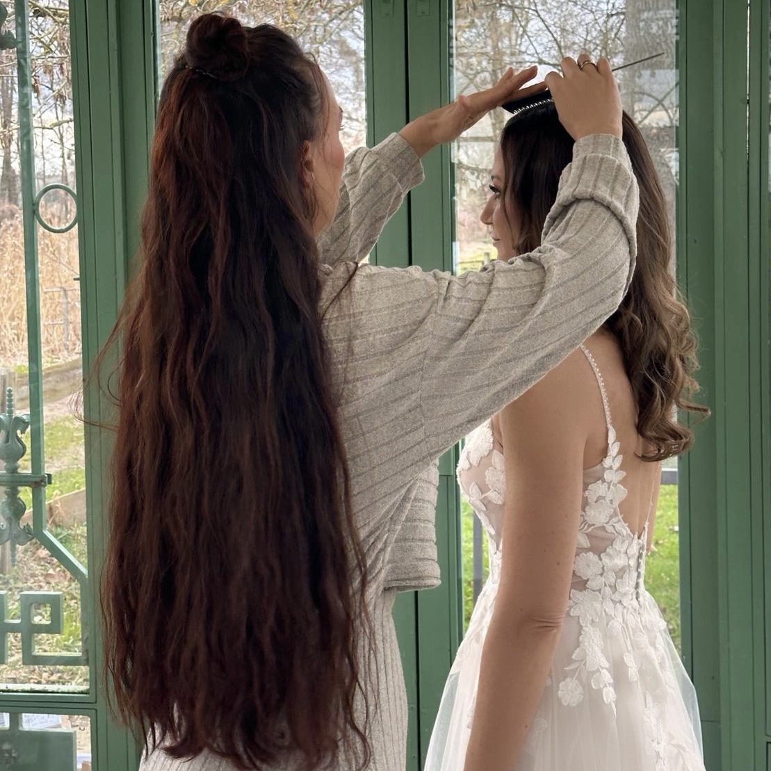 Ich bin mobil und komme am Tag deiner Hochzeit pünktlich zu deiner Wunsch-Location und kümmere mich um Hautpflege, Make-up und Frisur und helfe dir mit Schmuck, Schleier und Kleid.